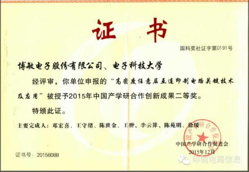 中國產(chǎn)學(xué)研合作促進(jìn)會與云南省人民政府共同舉辦的第九屆中國產(chǎn)學(xué)研合作創(chuàng)新大會上,博敏電子與電子科大共同申報的“高密度任意層互連印刷電路關(guān)鍵技術(shù)及應(yīng)用”項目榮獲創(chuàng)新成果二等獎。