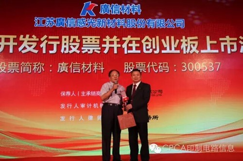 江蘇廣信感光新材料股份有限公司上市了!代表中國印制電路行業協會CPCA由鐳理事長、張瑾秘書長、洪芳和顧瑋珺副秘書長表示熱烈的祝賀!