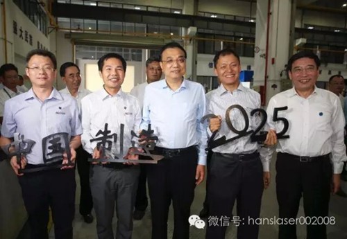 大族激光車間內,一個激光切割的“中國制造”字樣送到李克強手里。總理仔細端詳說,工藝很好不過應加上“2025”。工人笑答已做出來了,并端著它與總理合影。李克強鼓勵員工,“中國制造2025”大有希望,要在你們手上大放光芒。
