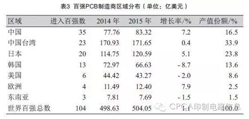 比較NTI-100表并對世界PCB產量作評估(表4)。2015年中國的產量占世界份額的48.5%,其中中國大陸制造商可能為90億美元,或約31%,這在2014年占28%。逐年有更多的中國大陸制造商進入NTI-100排名表。