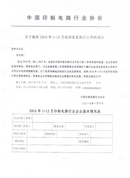 協會統計好后,要上報給中國協會(CPCA),要做“第十六屆(2016)中國印制電路行業排行榜”排名。請大家及時申報!