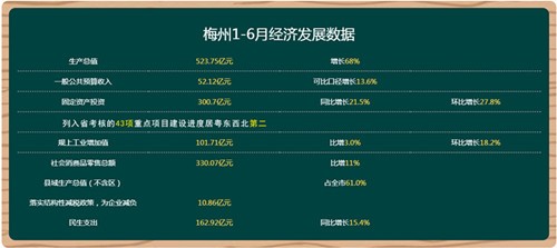 今年1-6月,梅州聚焦項目建設,有效投資進一步擴大。抓住國家擴大有效投資窗口期,上半年全市固定資產投資完成300.7億元,同比增長21.5%,環比增長27.8%。其中,列入省考核的43項重點項目建設進度居粵東西北第二;大力發展實體經濟,產業集聚效應進一步增強。堅持重實體、興實業,實體經濟發展向好,上半年全市規上工業增加值101.71億元,比增3.0%,環比增長18.2%;注重擴大內需,消費結構進一步升級。多渠道培育消費新增長點,上半年全市社會消費品零售總額330.07億元,比增11%;是重視縣域發展,三農短板進一步補齊。上半年,縣域生產總值(不含區)占全市的61.0%;深化改革創新,發展動力進一步激發。推進供給側結構性改革,全面落實“去降補”措施,有效供給不斷擴大。全面落實結構性減稅政策,為企業減負10.86億元;堅持民生為重,百姓福祉進一步提升。上半年,全市民生支出162.92億元,同比增長15.4%。