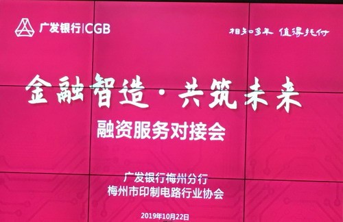 為積極配合政府和園區打造百億電路板產業的發展規劃,滿足企業個性化融資需求,支持園區龍頭企業、上市公司做強做大,服務園區中型企業發展壯大,構建銀企“互利雙贏”合作模式,2019年10月22日下午,廣發銀行梅州分行在白天鵝酒店成功舉辦“金融智造•共筑未來”融資服務對接會,梅州市工業和信息化局、東升工業園區、梅州市印制電路行業協會會長等領導和近50名企業家代表出席了此次活動。